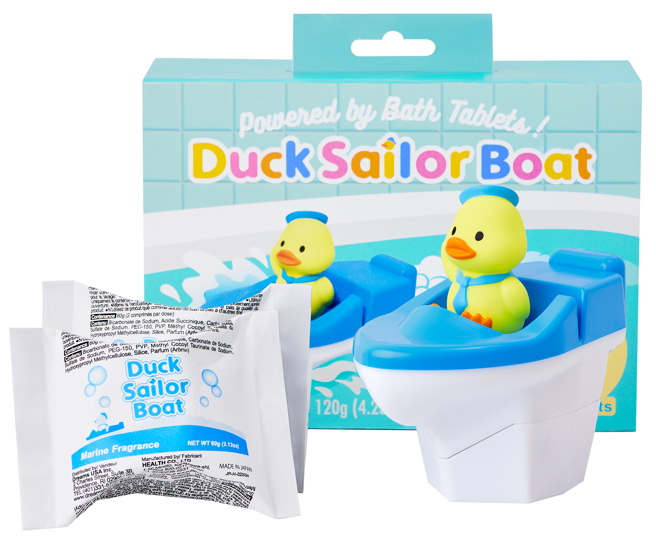 Make bath time an adventure with our Duck Sailor Boat interactive bath toy! Set sail with Pink and Blue as they speed through your tub in their adorable power boats. As the ocean-scented bath tablets hidden inside their hulls melt. Pink and Blue take off!?